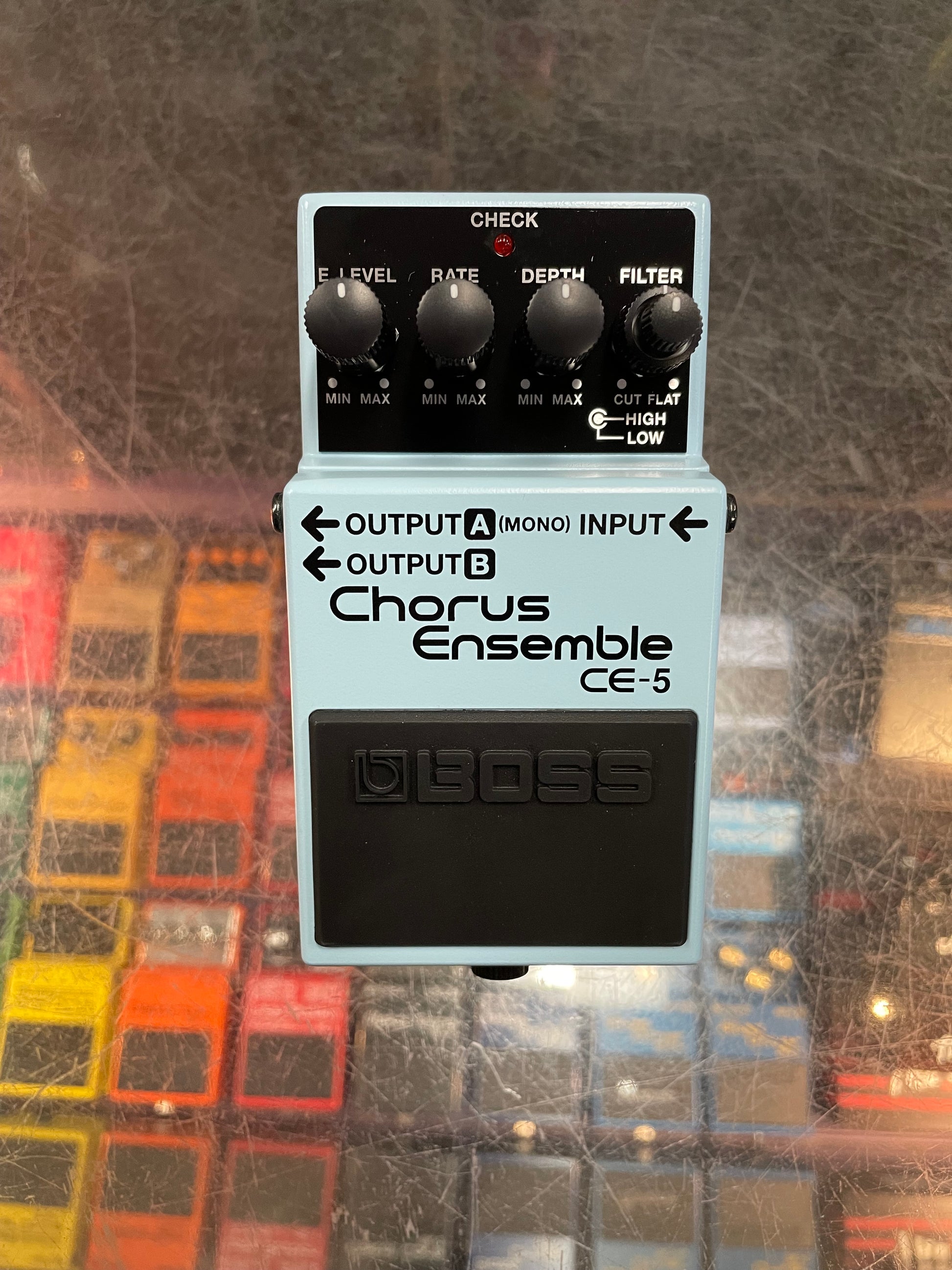 The Boss CE5 Stereo Chorus Ensemble Pedal covers a wide frequency range and features high and low cut filters.