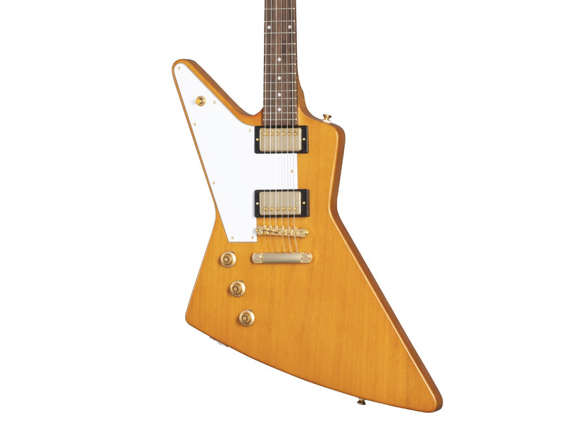 Made in partnership with the Gibson Custom Shop, the 1958 Explorer is Epiphone’s impressive recreation of one of the most famous and valuable vintage guitars ever made. It brings authentic 1958 Explorer details to guitarists everywhere at a breakthrough price. Like the ultra-rare original Gibson models from 1958, it features a Korina body and a Korina neck with a long neck tenon and a 1958 Explorer neck profile. It is also equipped with an Indian laurel fretboard and gold hardware. The electronics are also top-notch, with Gibson Burstbucker 2 and Burstbucker 3 pickups wired to individual volume controls and a master tone control with CTS pots and a Mallory capacitor, along with a Switchcraft 3-way pickup selector switch and 1/4” output jack. An Epiphone x Gibson Custom logo on the back of the headstock is also proudly displayed, and a hard-shell case is also included