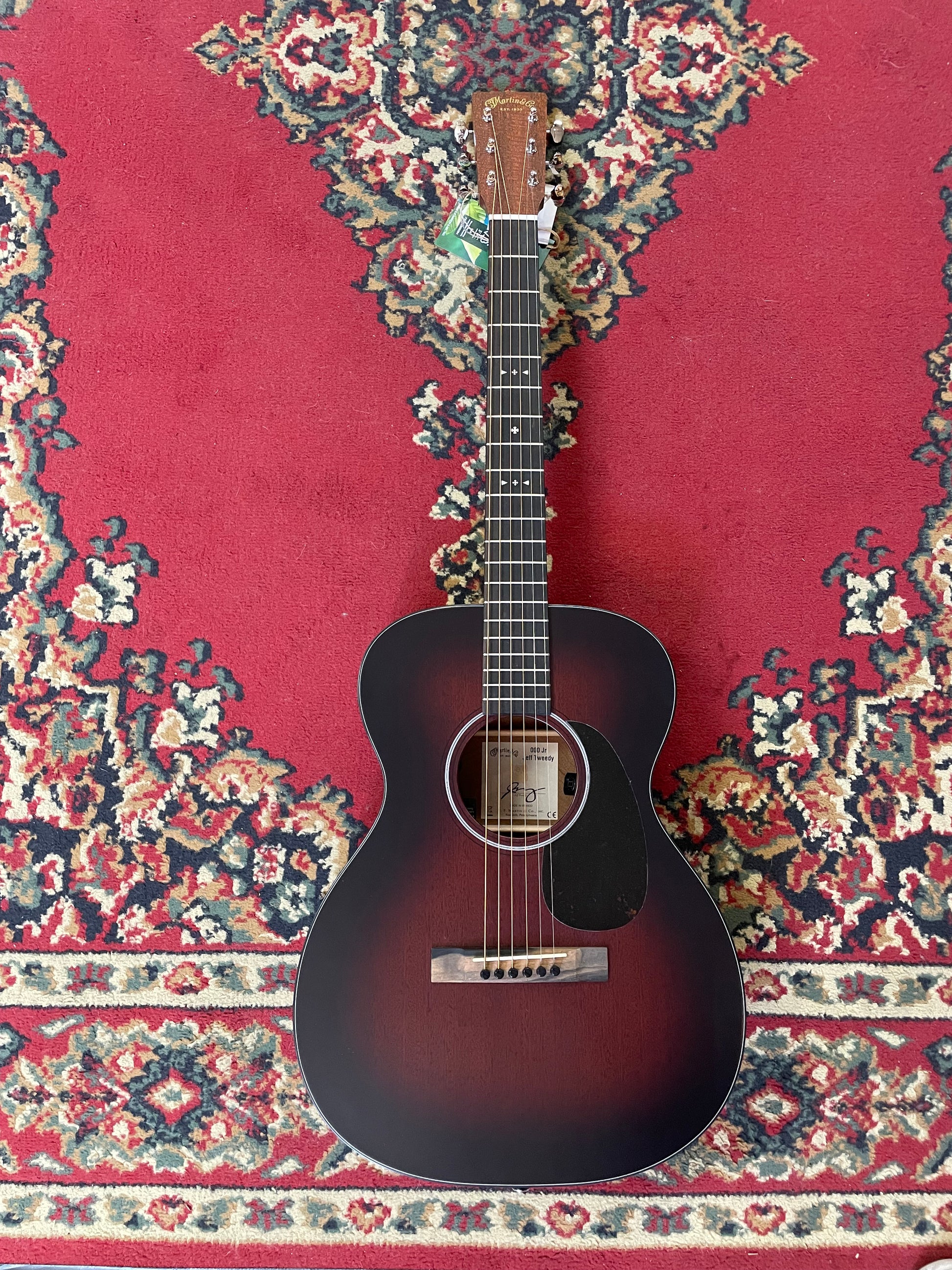 Visually, the 000 Jr E Jeff Tweedy captures Jeff’s signature style in a sleek, accessible design. The satin Tweedy Burst finish adds richness and depth, accented by black binding, an old-style rosette, and nickel open gear tuners. The ebony fingerboard features elegant Foden-style inlays, while the straight-line ebony bridge keeps the look and sound clean and grounded. Martin E1 electronics make it plug-in ready, with onboard volume and tone controls and a built-in tuner.