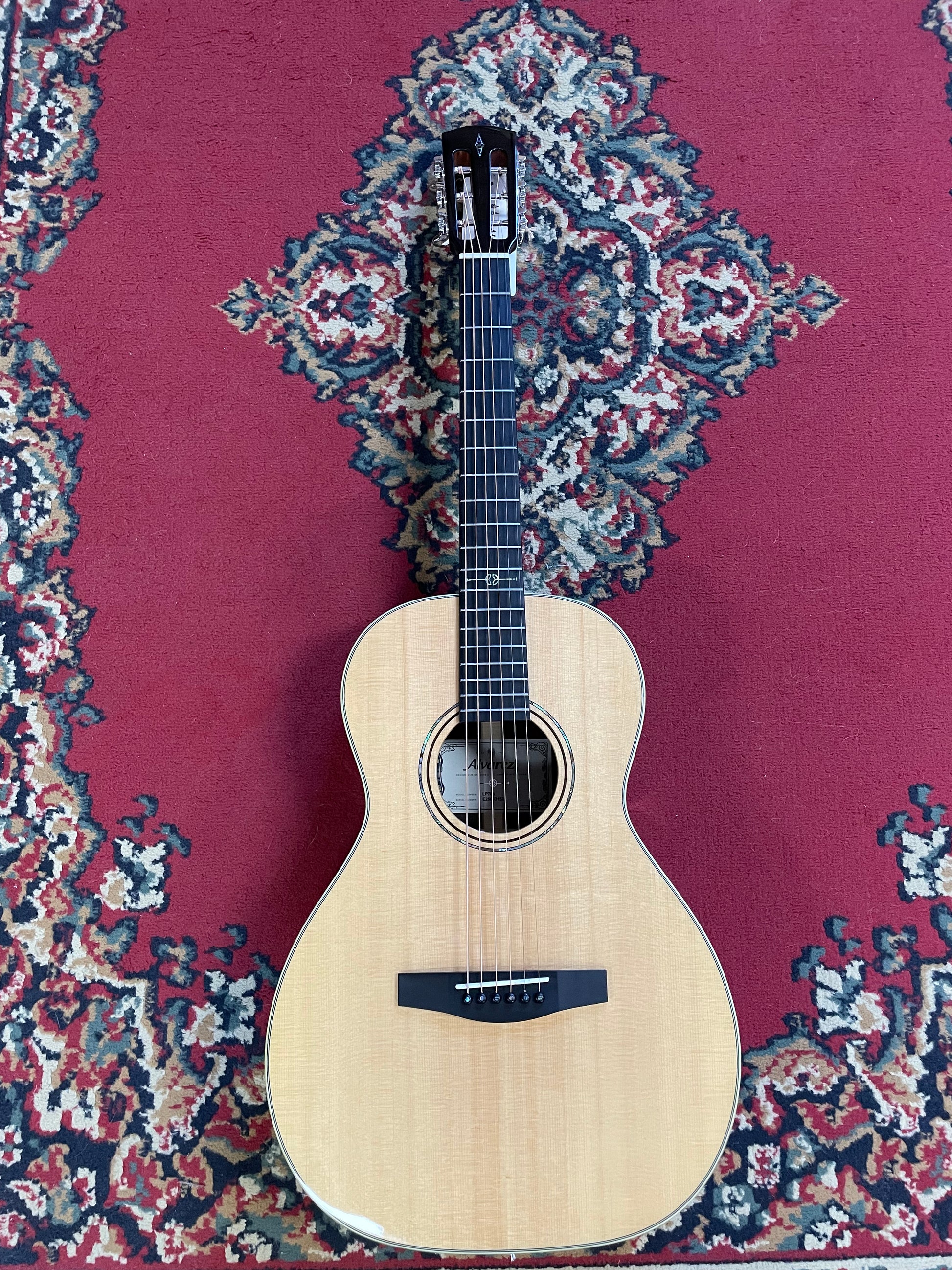 Aesthetically, Laureate is a traditional guitar series in the sense its body shapes are based on guitars from the late 1800’s to the 1930’s. With this in mind, we made the decision not to use our Bi-Level bridge and to stay closer in keeping with a traditional approach, and a full, single level bridge style. The Laureate bridge has its own unique styling and is cut from the finest black ebony.