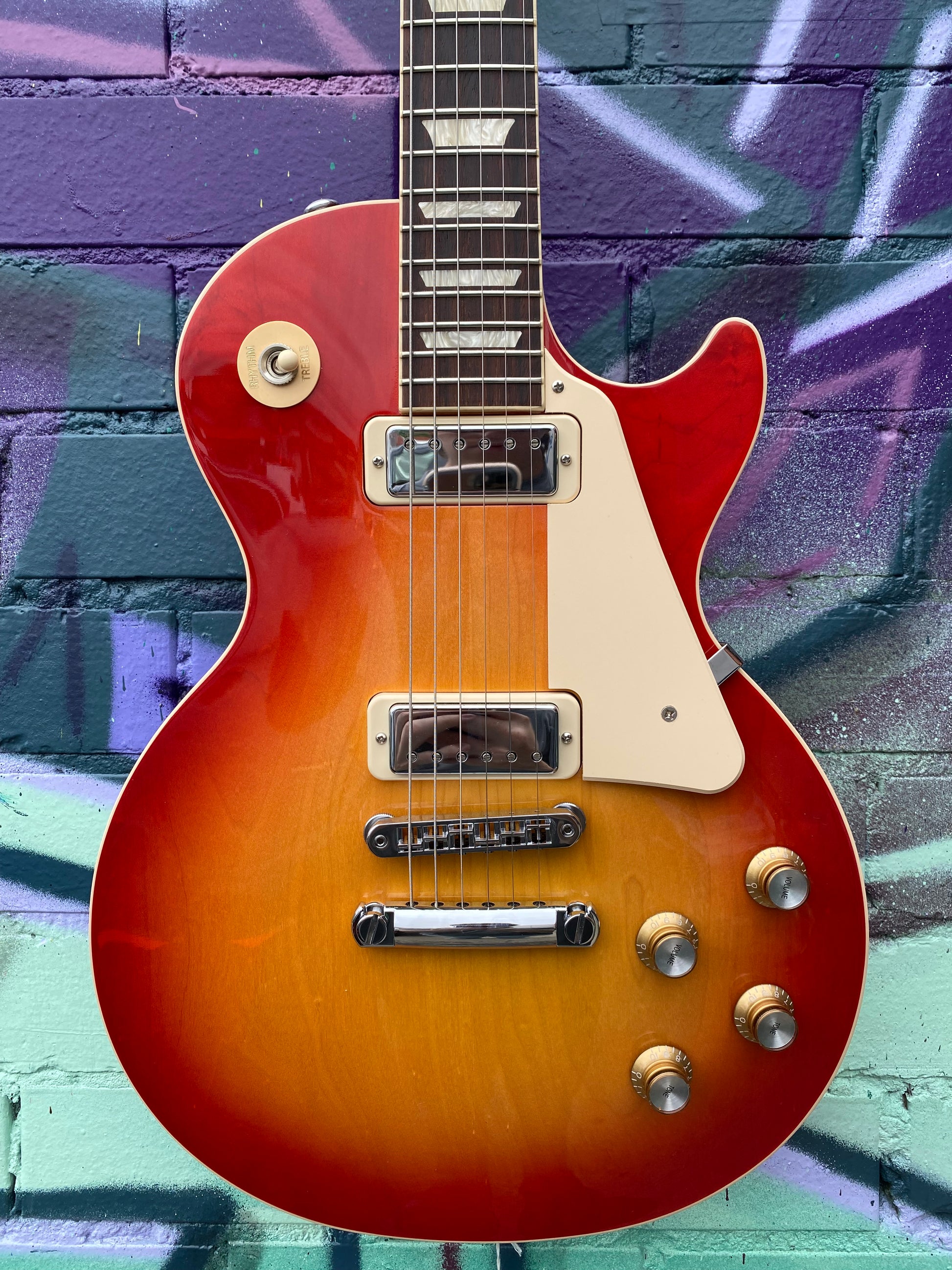 First released in 1969, the Deluxe saw the introduction of the mini humbucker™ to the Les Paul lineup. Mini humbuckers retain the hum-free performance of their full-sized cousins but with a somewhat clearer and brighter tonality. The new Deluxe has features that were inspired by those early models from the 1970s, with a non-weight relief mahogany body and bound maple top, a bound mahogany neck with a Rounded C profile, vintage-style Keystone tuners, Graph Tech® nut, and a traditional Les Paul control layout with 2 Volume and 2 Tone controls wired with Orange Drop® capacitors. Available in classic Goldtop and 70s Cherry Sunburst gloss nitrocellulose lacquer finishes.